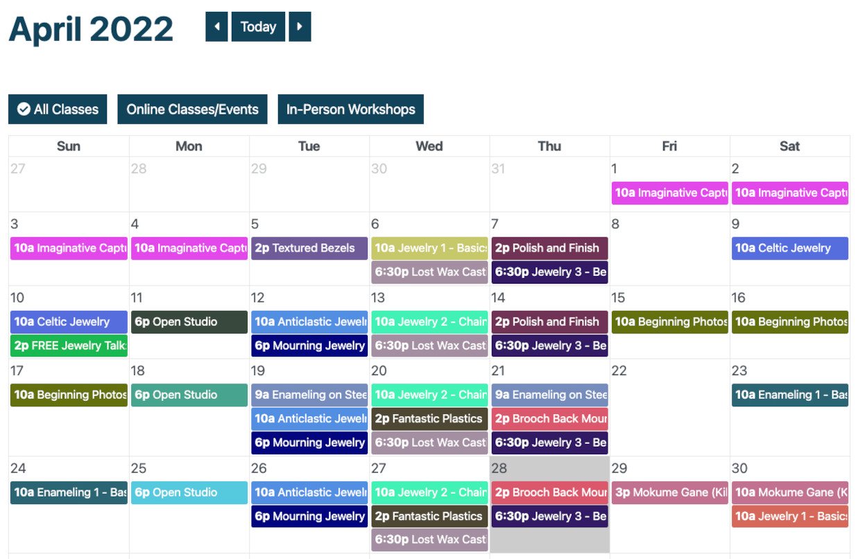 Go to our class calendar and browse classes by date or technique. You can filter the calendar to show all classes, just in person classes, or just online classes. Click on a class to go to the class page, where you can see details like price, dates, description, prerequisites, and pictures of class projects. This is an example of the class calendar page.