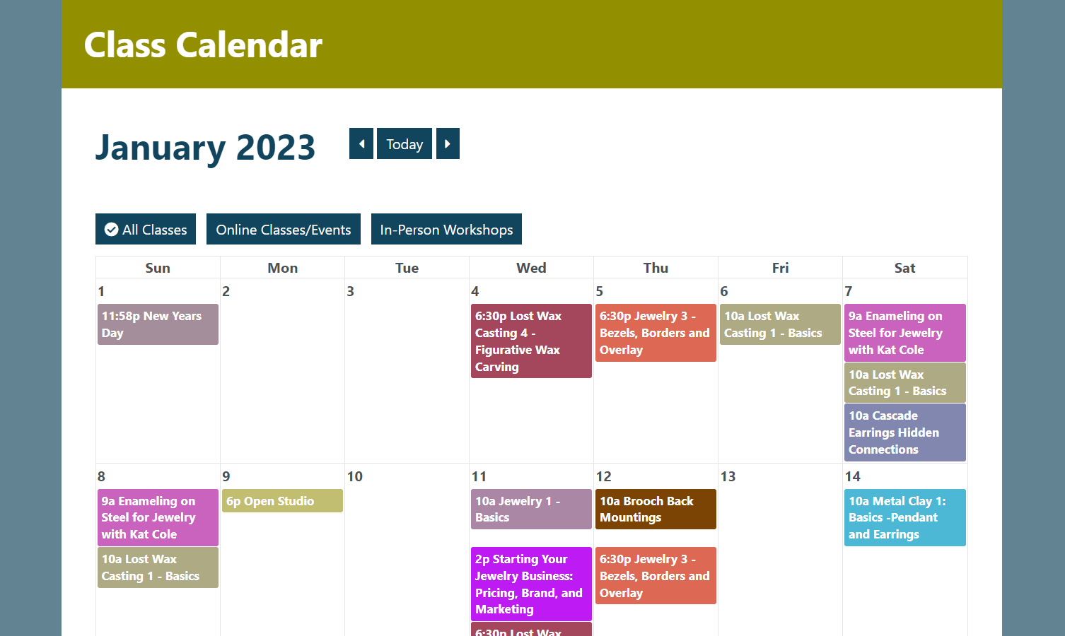 Be sure to select: the right date and time, and in person (to take it at school) or online (to stream the class live on Zoom). The class will be added to your cart. Pay for your classes in the cart. When you get the confirmation window, you’re done!