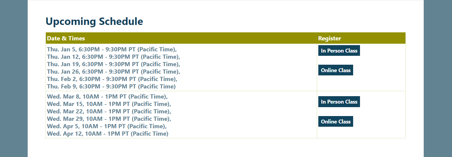 Just go to our class calendar. Click on any class on the calendar or under the list of techniques on the left side of the page. If it’s open for registration, there will be registration buttons at the top and bottom of the page.