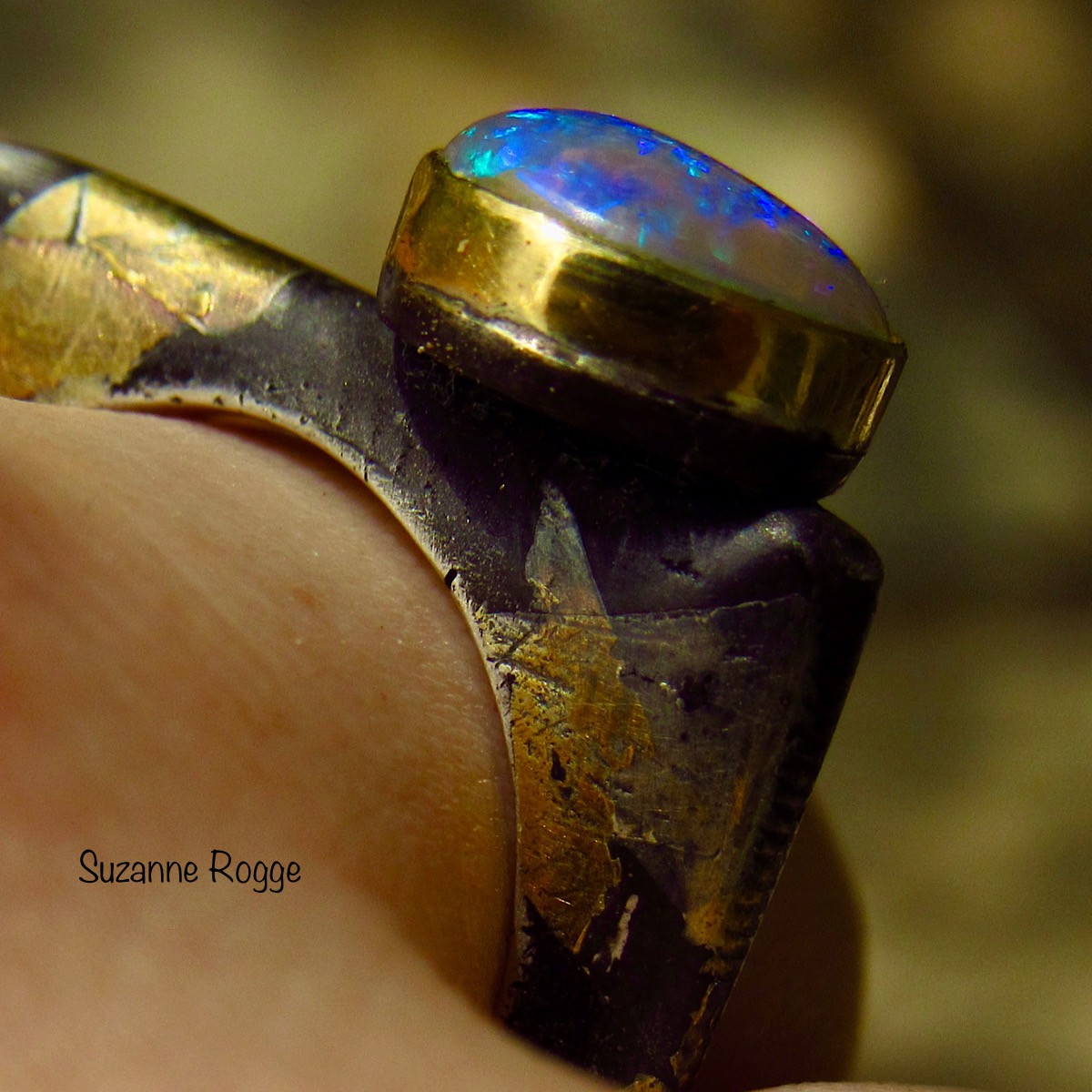 Fine Silver & Fused 24k Gold Square Ring with Semi Black Opal in 18k Gold Bezel