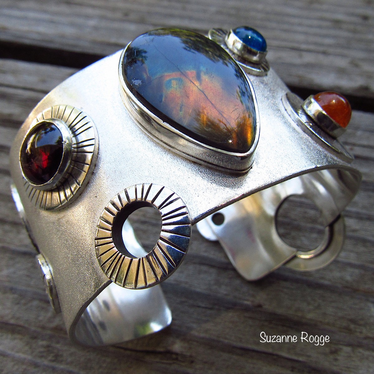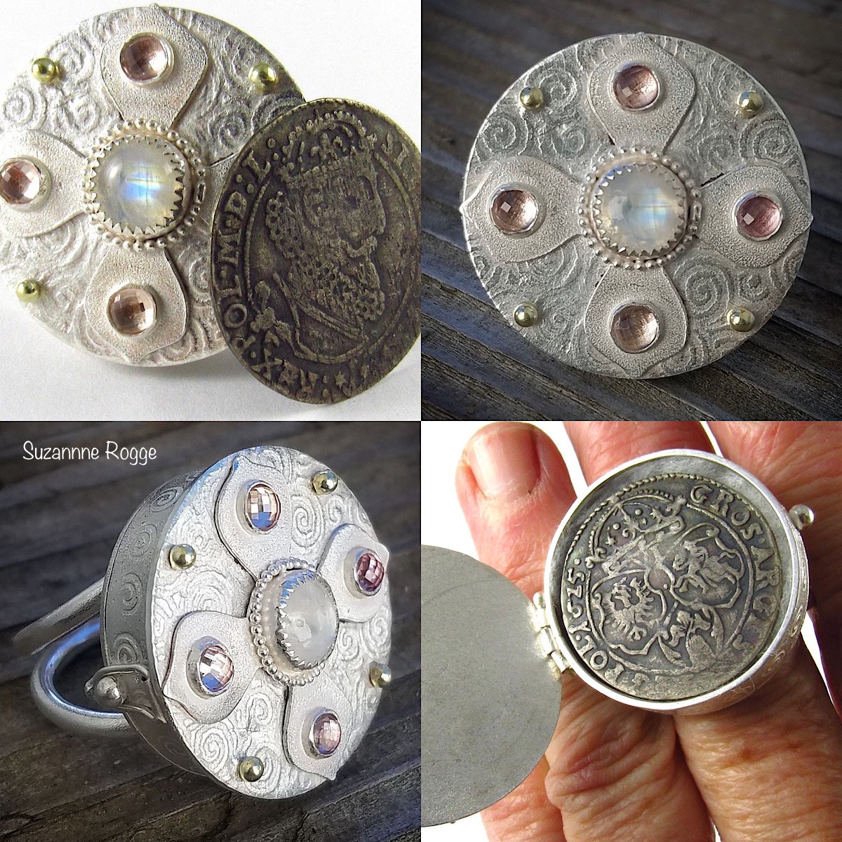 Time Traveler Ring in Silver & 18k Gold with Moonstone, Mahenge Garnets, & 1625 Polish Coin