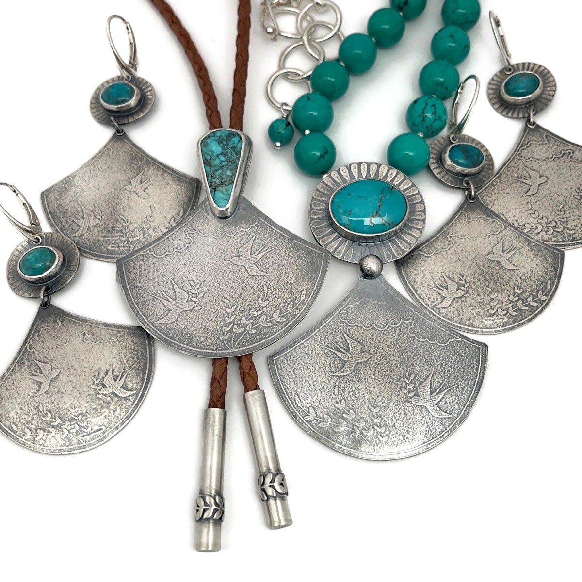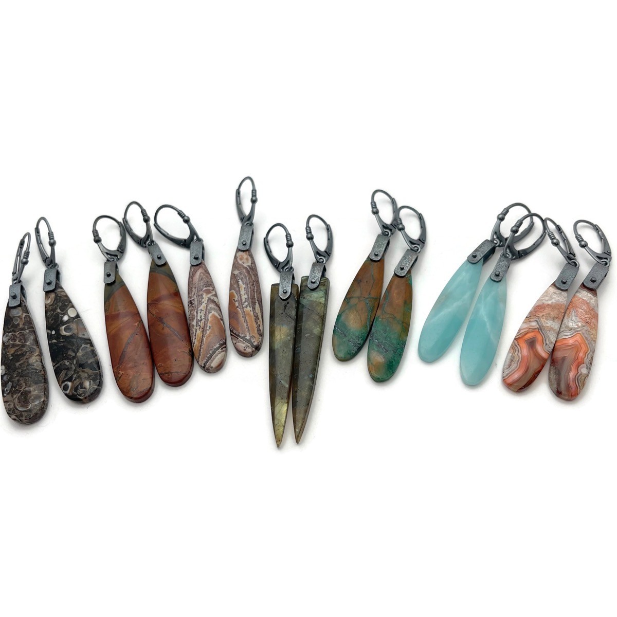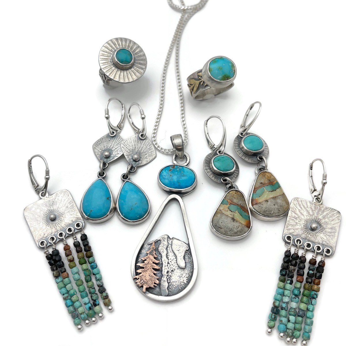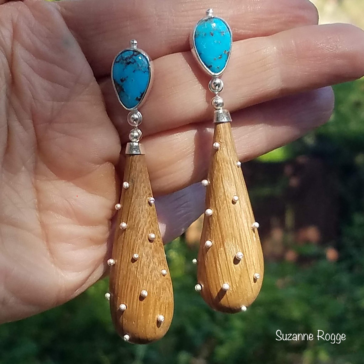 Silver, French Oak, and Blue Diamond Turquoise Drop Earrings